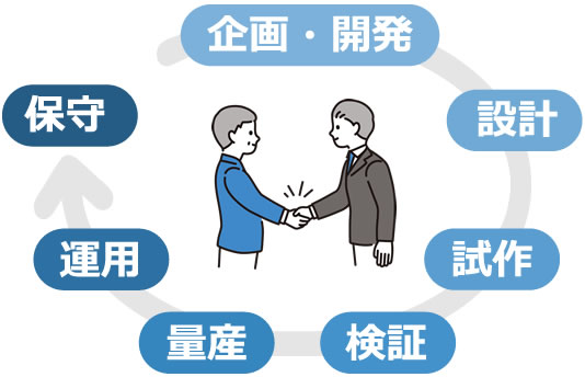 などの技術を総合的に駆使し、お客様の求める電子機器、省力化機器・自動化機器を開発しています。ワンストップ(一度の注文)で企画開発、設計、試作、量産そして保守までをお引き受けすることで、